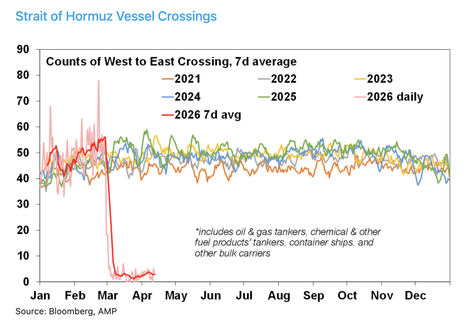 - A stagflationary hit of higher inflation and weaker growth is now baked in with the uncertainty being how long it’s sustained. The flow of ships through the Strait of Hormuz remains the key – as it has been since day one of the War.