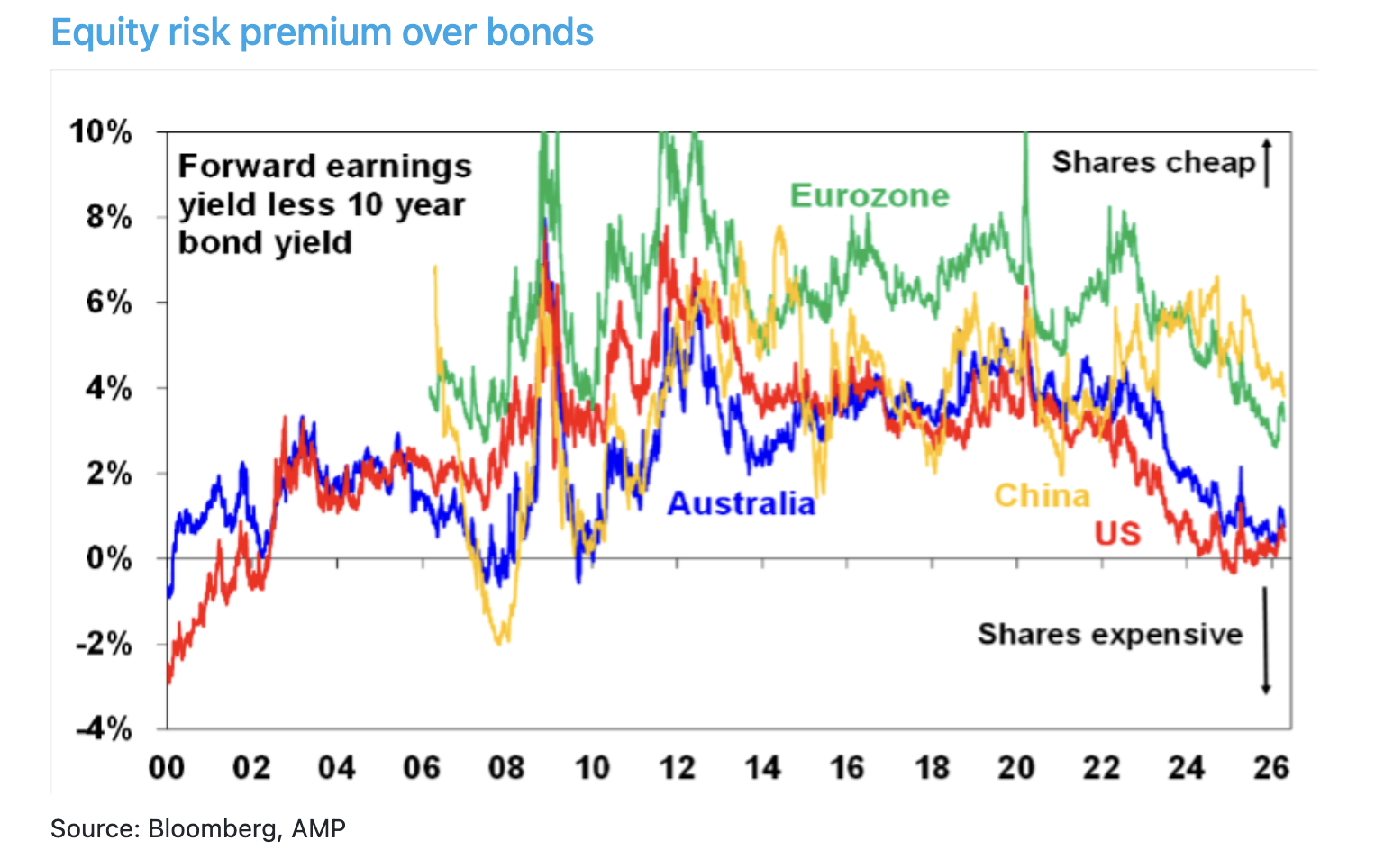 Finally, all of which runs the risk of more constrained and volatile investment returns. Which should mean that shares should be offering a higher risk premium over bonds. But at present the risk premium offered by US and Australian shares – as measured by the forward earnings yield less 10-year bond yields – remains very low.